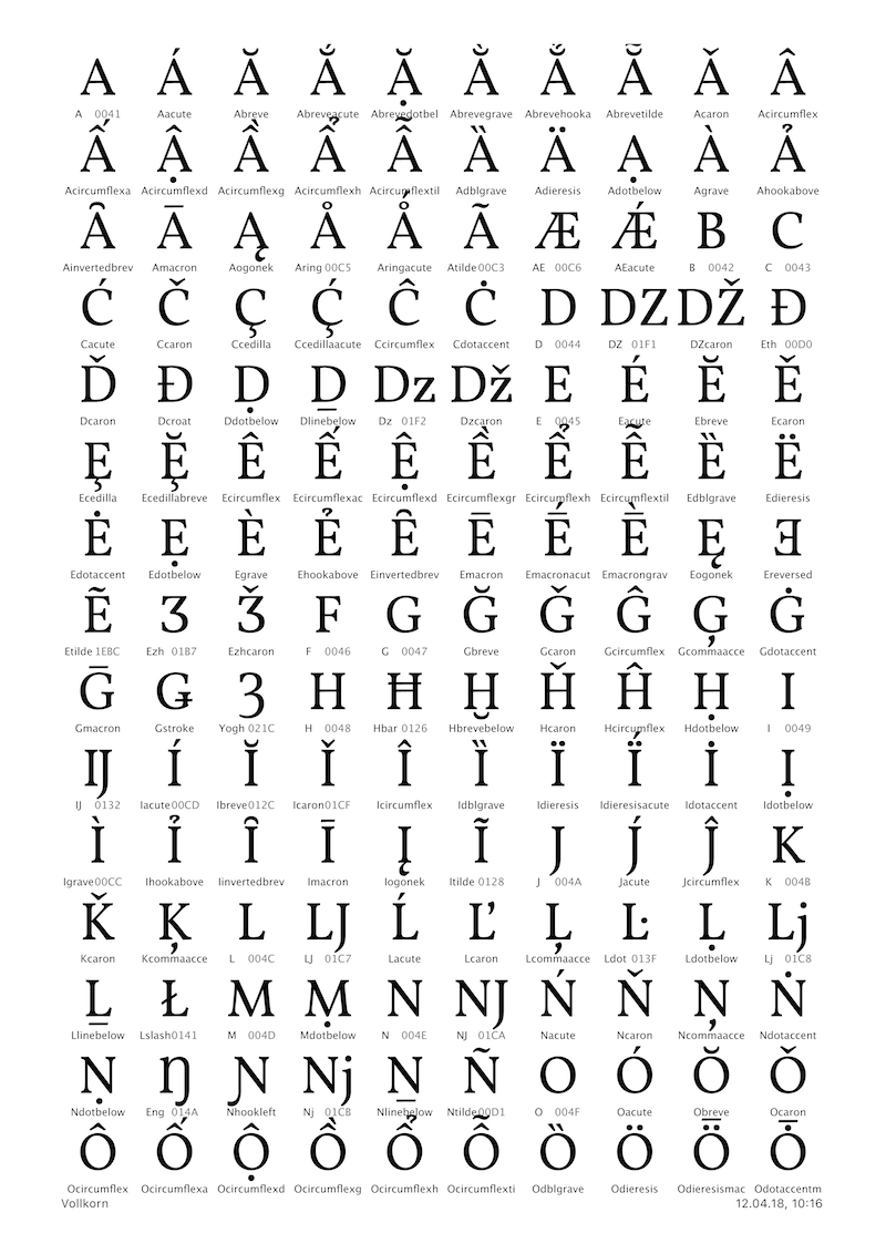 Vollkorn containes 2150 characters. It supports the following character sets: